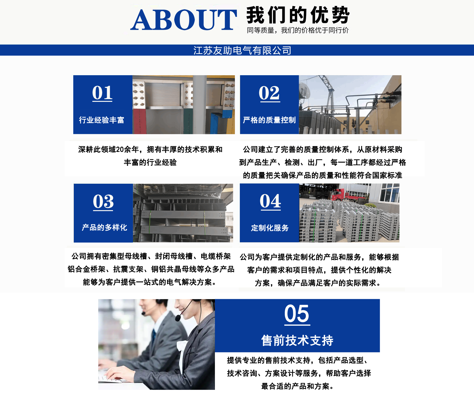 江蘇友助電氣有限公司地處中國工程電氣生產(chǎn)基地-一江蘇省揚(yáng)中市。經(jīng)營范圍:電纜橋架,母線槽(橋),管型母線,銅軟連接(伸縮節(jié)),高低壓開關(guān)柜,配電箱,抗震支架產(chǎn)品系列。 公司宗旨:客戶至上。已成功為江蘇二十屆省運(yùn)會會場-泰州體育館,南京寶龍商業(yè)綜合體,張家口百兆瓦風(fēng)電場,濟(jì)源市婦幼醫(yī)院,威海市未來科技園,湖北皇恩燁新材料科技有限公司,南京中央路小學(xué),南通中天大酒店,新疆新安特鋼有限公司,河北省送變電有限公司,南京南微醫(yī)學(xué)研發(fā)基地等多項(xiàng)工程配套服務(wù),我們愿與您精誠合作,互利共贏!公司技術(shù)人員深耕橋架,母線領(lǐng)域30年,為您提供橋架,母線槽疑難問題解決方案。母線槽不論每相是單排,雙排,三根排重疊,不管有多少個水平彎、垂直彎,轉(zhuǎn)接排在發(fā)貨前預(yù)裝一遍,確保尺寸無誤。到現(xiàn)場直接擰螺絲,效率高,橫平豎直,規(guī)規(guī)矩矩,符合標(biāo)準(zhǔn),供電局,業(yè)主,監(jiān)理,驗(yàn)收易通過。供貨周期3-7天。為了讓尊貴客戶您,設(shè)備安全通電,高枕無憂。我們提供如下售前售中售后服務(wù): 售前:免費(fèi)技術(shù)支持,咨詢。 售中:免費(fèi)現(xiàn)場精確測繪、設(shè)計。 售后:安裝服務(wù),免費(fèi)指導(dǎo)。 質(zhì)量是生命,客戶是源泉。承諾客戶的,一定全力做到。讓我們一起進(jìn)步!...